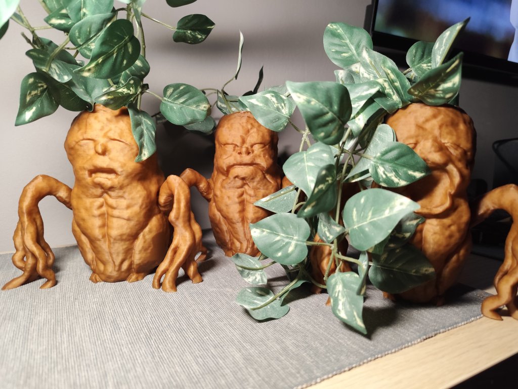 Tiskneme ve dvou variantách. V první variantě dostanete mandragoru či mandragory uvnitř duté, vhodné k naaranžování suchých rostlin nebo rostlin umělých. V ceně této varianty je také 3D tištěný válec do kterého lze aranžovat odřezky, štěpy nebo řezané květiny. Na fotografiích je použita umělá girlanda SMYCKA, kterou dostanete v obchodních domech IKEA (tady).