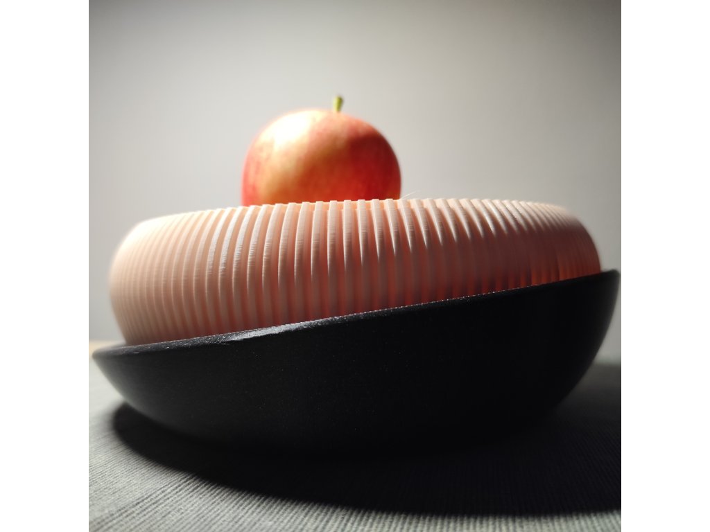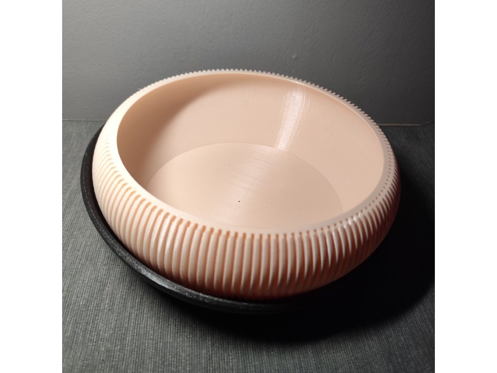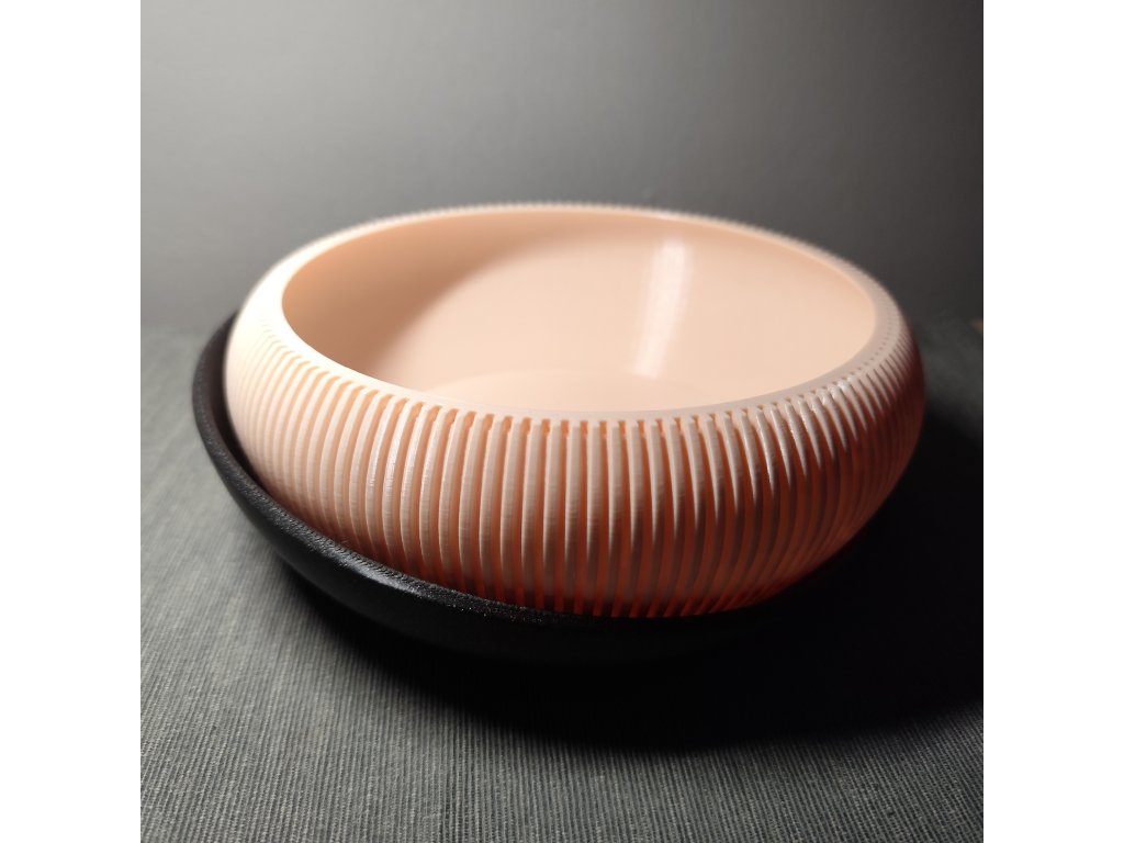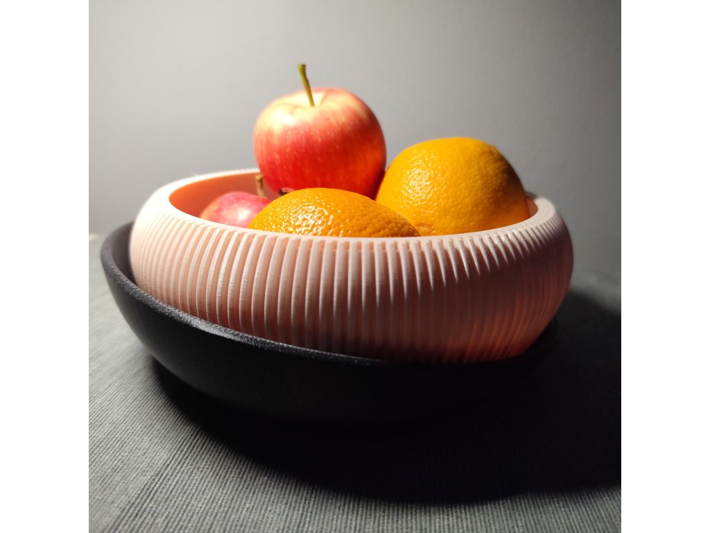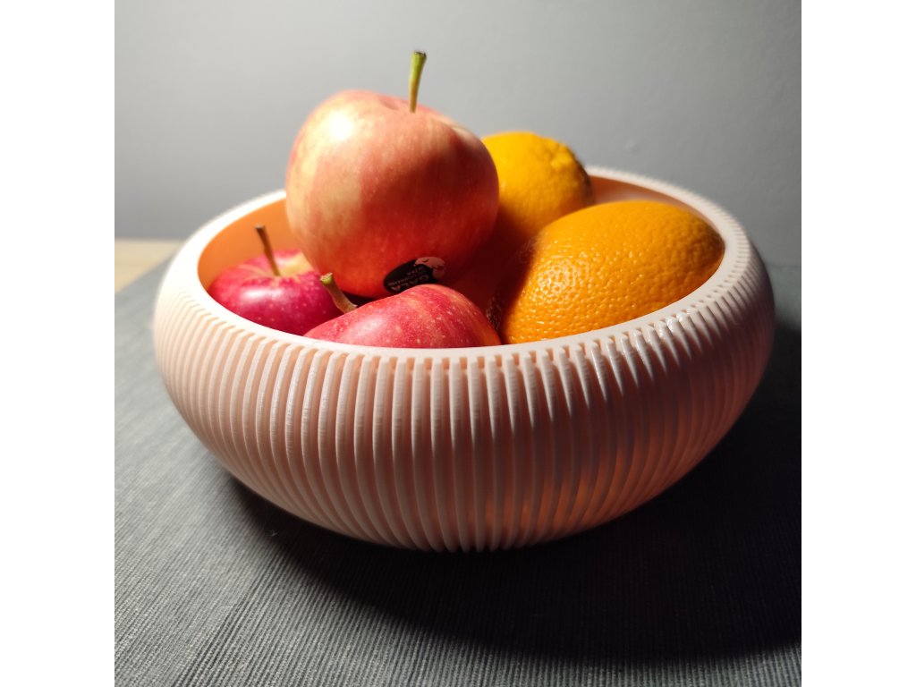 Tištěno z kvalitního PLA, ovšem tento materiál jako takový nemá potravinářský atest. Tedy ovoce nebo třeba bonbóny do ní umístit můžete, guláš s osmi do ní prosím neservírujte. PLA navíc nepatří mezi horku odolné materiály, nedoporučujeme tedy ani mytí v horké vodě či v myčce.