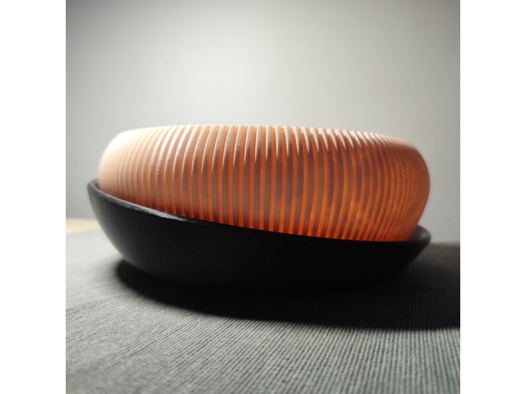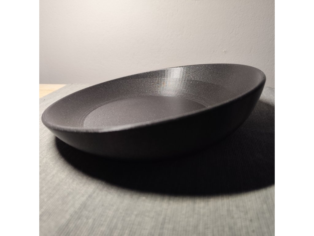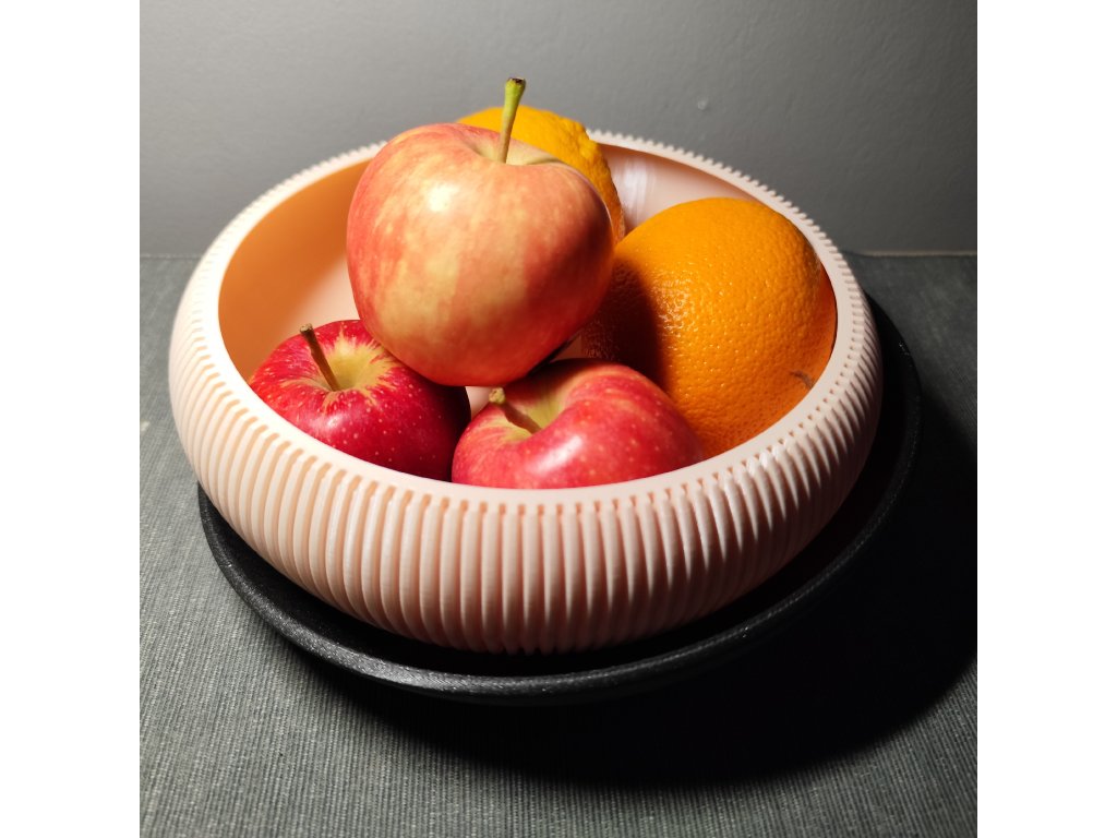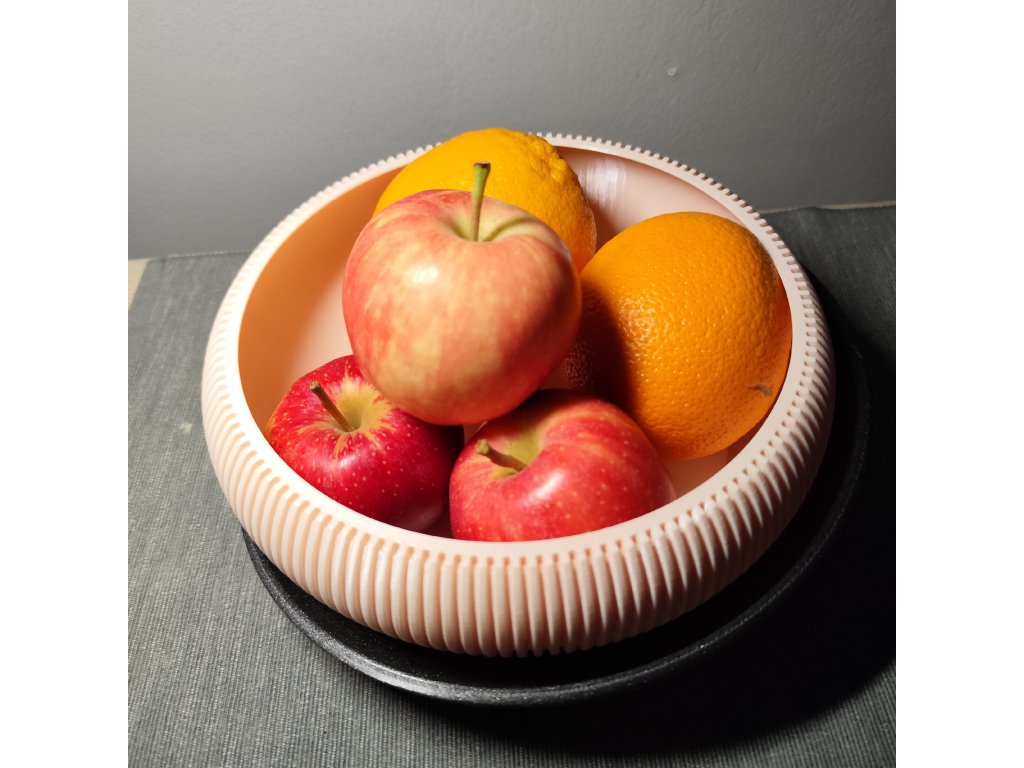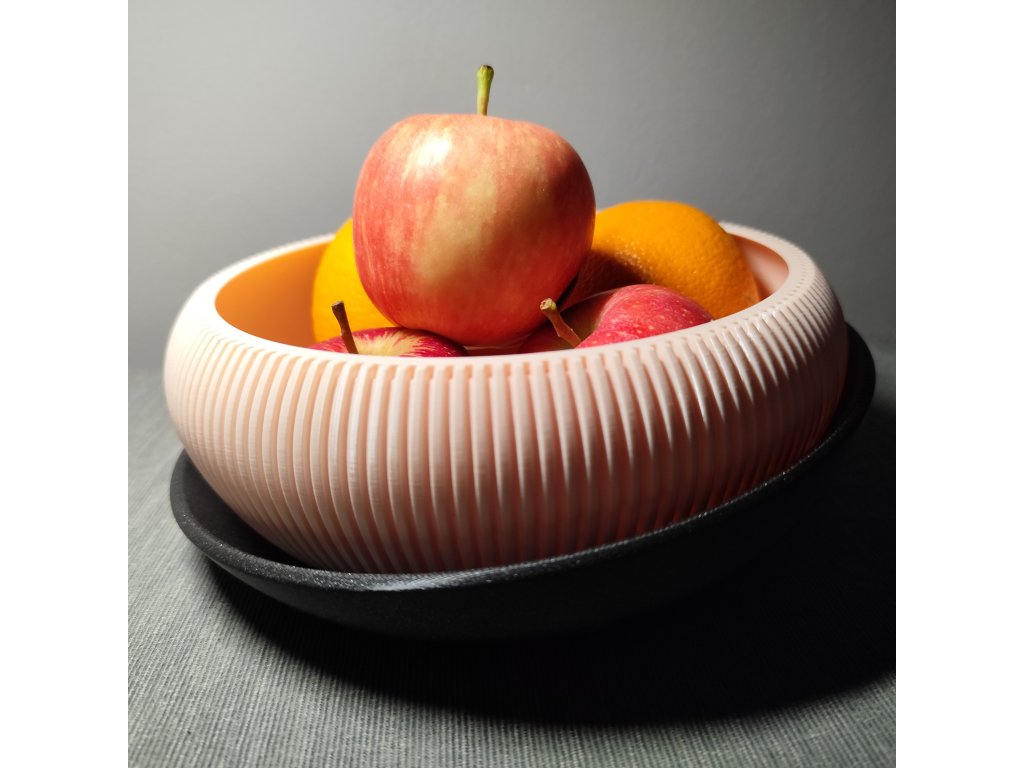 Tištěno z kvalitního PLA, ovšem tento materiál jako takový nemá potravinářský atest. Tedy ovoce nebo třeba bonbóny do ní umístit můžete, guláš s osmi do ní prosím neservírujte. PLA navíc nepatří mezi horku odolné materiály, nedoporučujeme tedy ani mytí v horké vodě či v myčce.