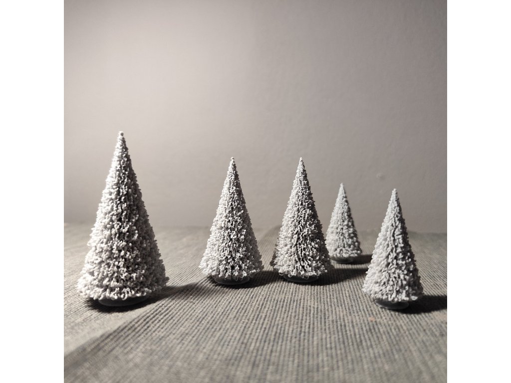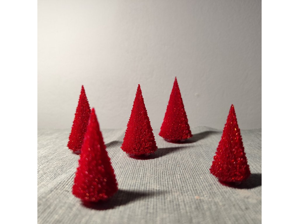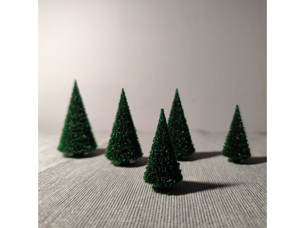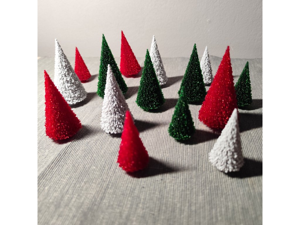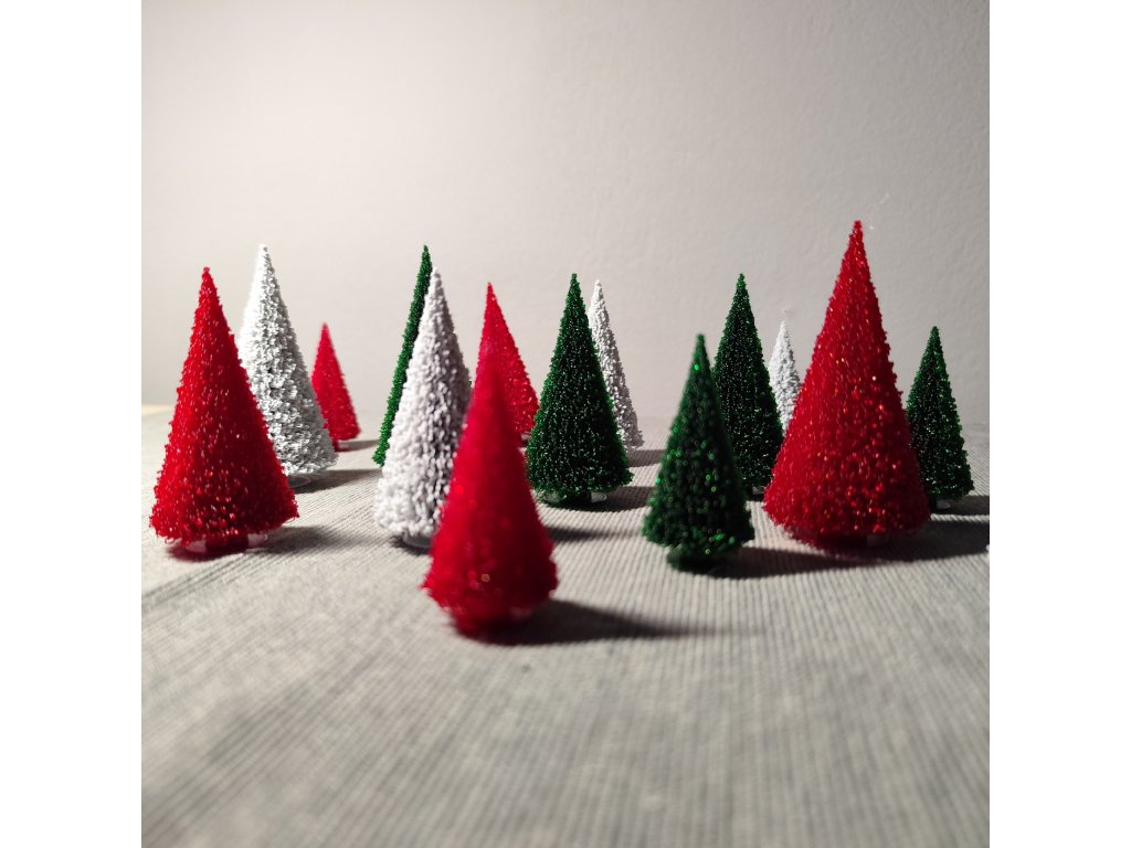 Sada šesti či dvanácti miniaturních vánočních stromečků. Použitelné jako dekorace samostatně, nebo jako doplněk k dalším dekoracím (viz fotogalerie). Barva po dohodě dle aktuální dostupnosti materiálu - požadavek prosím upřesněte při objednáváni do poznámky.